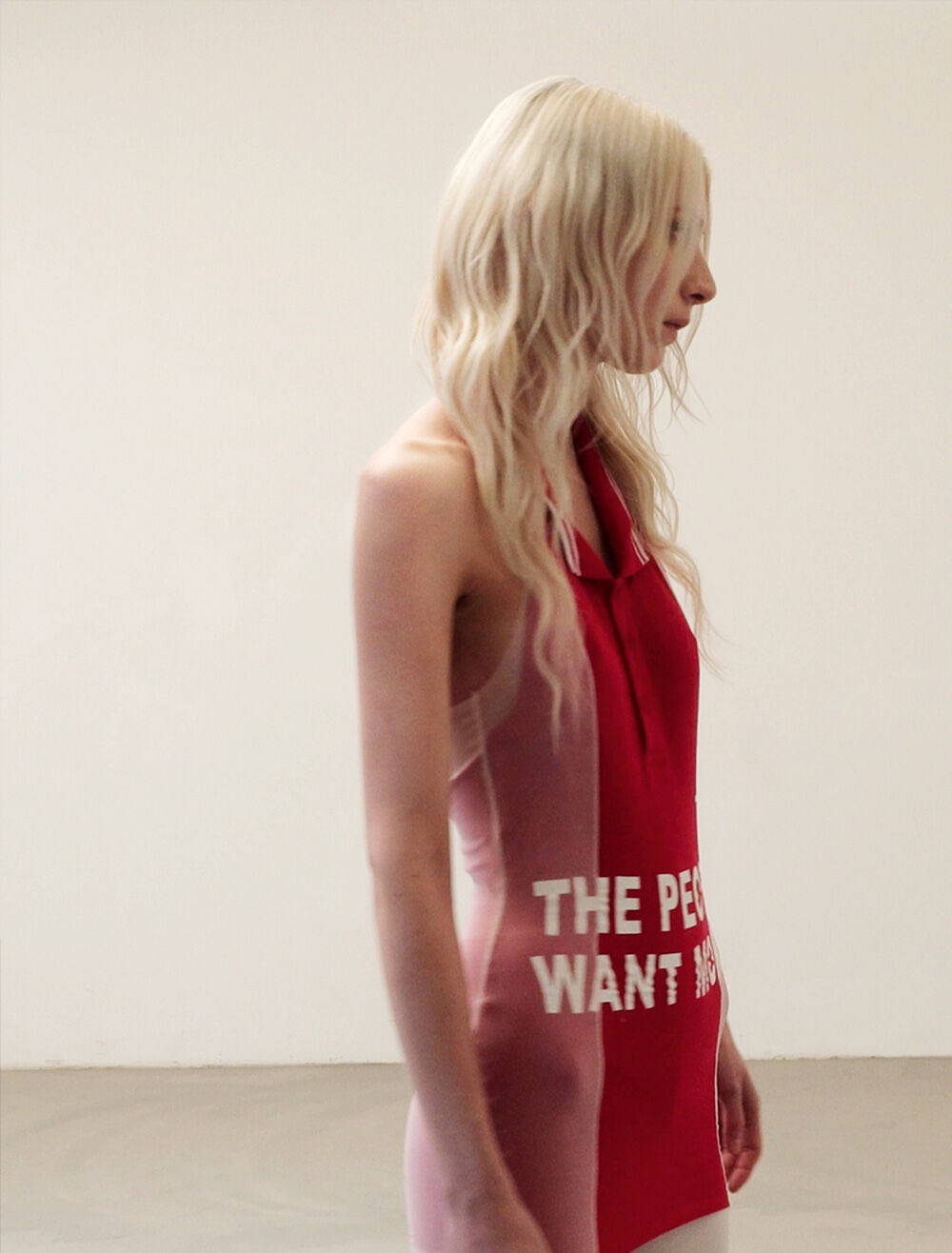 Sie ist schnell zu einer gefragten Designerin für Kylie Jenner geworden, die Arnika für die gemeinsame Gestaltung einer Kollektion mit ihrem Label Kai engagiert hat. Diese umfasst tanzflächenreife Twinsets und Ausgehkleider, die in Scheiben geschnitten und gewürfelt sind, um ein wenig Haut zu zeigen, und die mit Pailletten übersät sind. Der Reality-Star und Geschäftsmogul ist nicht der Einzige, der das Berliner Talent zu schätzen weiß. FKA twigs wurde auf Instagram beim Voguing gesehen, mit einer der Baguette-Taschen der Marke – gefertigt aus Jersey, das in Scheiben geschnitten und zu einem spinnennetzartigen Wandteppich gewürfelt wurde – unter ihrem Arm. Währenddessen erlebte Charli XCX einen Brat-Sommer in einem bauchfreien Top mit einem Ausschnitt an den Brüsten und einem Höschen aus dem Kragen eines Herren-Poloshirts.
