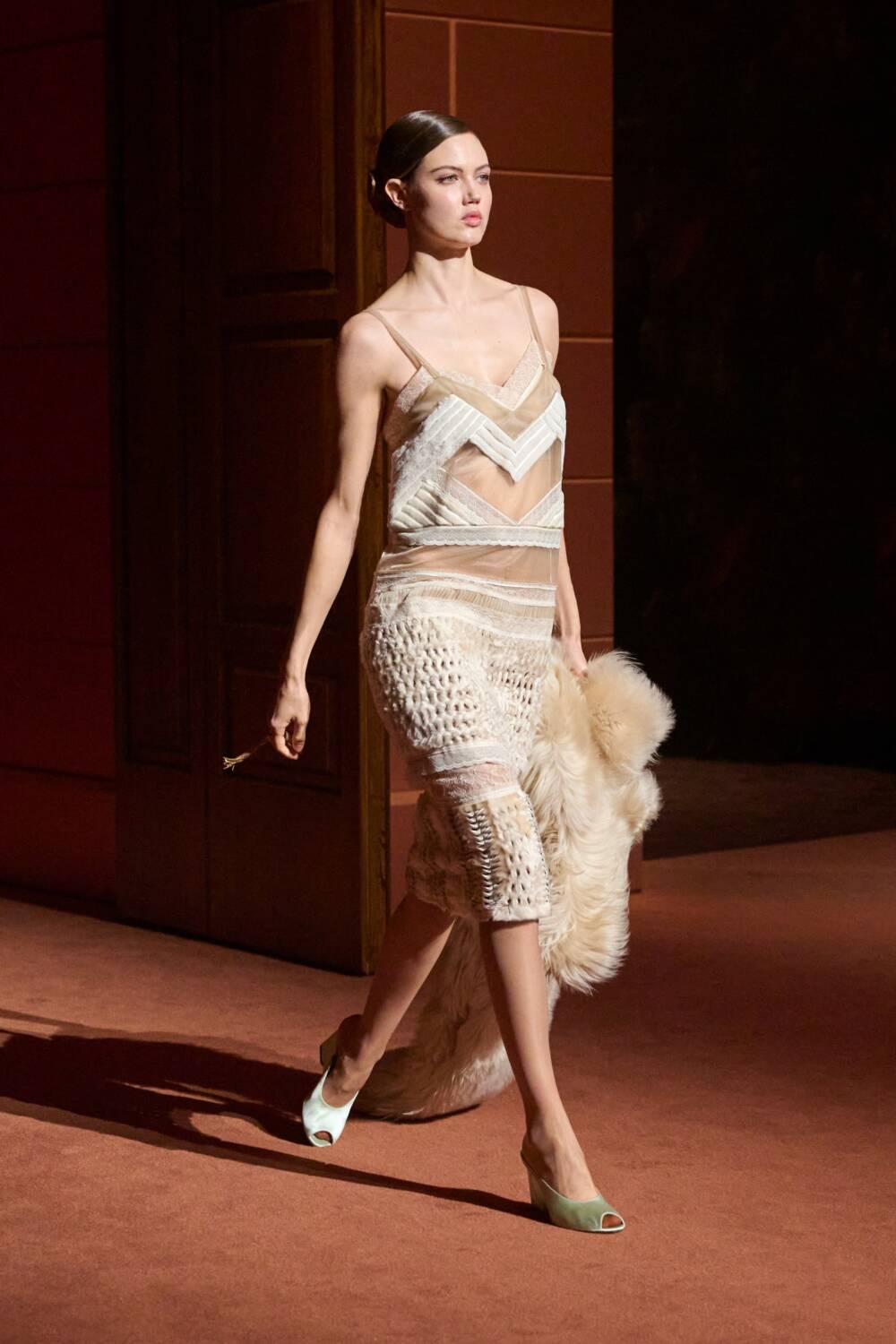The family presence was felt in the carpeted and mirrored show space, designed to resemble the historic Fendi boutique on Via Borgognona, where the five Fendi sisters worked. The invite was a mini Fendi family photo album, showing the dynasty through the years in looks that directly inspired the designer who explained she’d designed from personal memory rather than a deep dive into the archive.