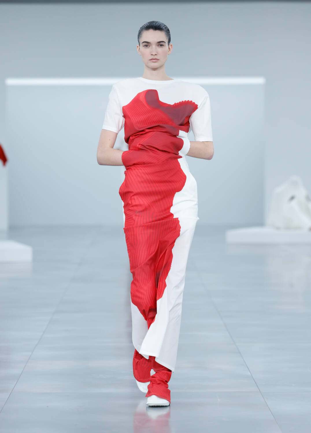 Red, blue, green and pink painted the runway. Then the question arose: is that a pocket or a hug? A sleeve or a belt? The placement of pockets forced arms into self-embracing gestures, as if the garments were cradling the wearer. Weighted white shoes grounded the pleated structures above. Sleeves became hats, collars pockets and denim jackets collapsed into bags and blank shopping bags transformed into shirts. Everything was wearable, yet unexpectedly so.