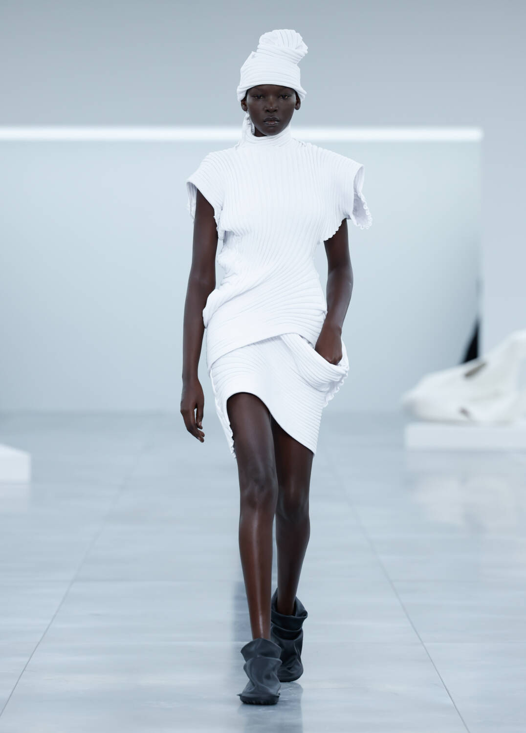 And at the end, a shift. Voluminous black forms stumbled onto the runway – life-sized pillow-puffers with tassels trailing behind. Peplum was reimagined, stripped of gender. Abstract trousers twisted into four-legged silhouettes, because who, or what, does Miyake dress? Folded pockets were turned inside out and became angular trousers. The final looks featured knitted faces (hats), concealed in cascading fabric (dresses). It as a reminder that a garment is only as powerful as the way it is worn.