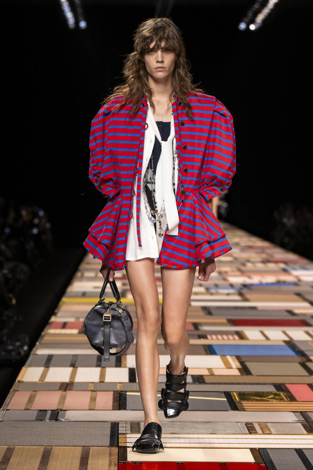 Renaissance-inspired jackets with generous sleeves and peplums were blouse-like in their lightness and worn with cycling shorts and sandals whose straps were lifted from the handles of trunks. Pirate trousers were layered under gathered georgette dresses and sweeping capes. Some pieces were made from a complex collage of materials – tweed, lace, embroidery, crystals and bejewelled appliqués – a modern interpretation of renaissance finery. The craft work was dazzling.