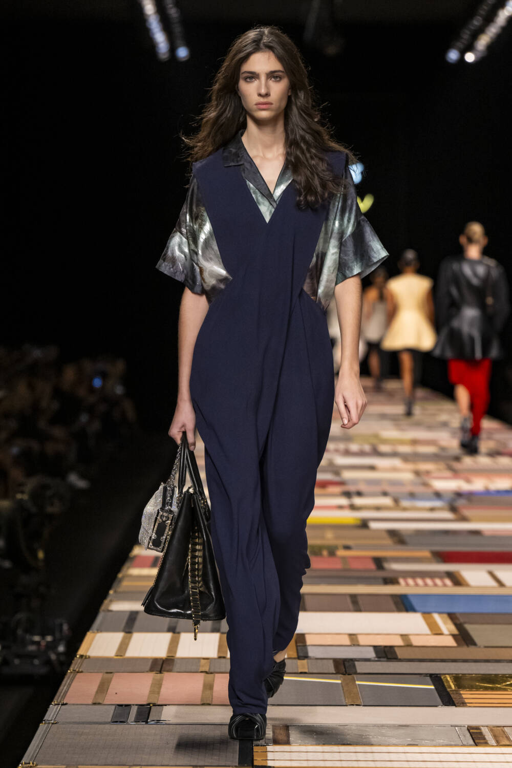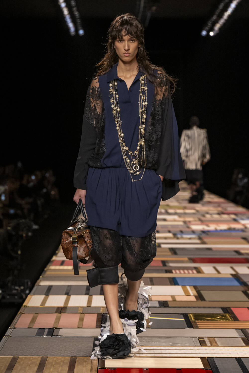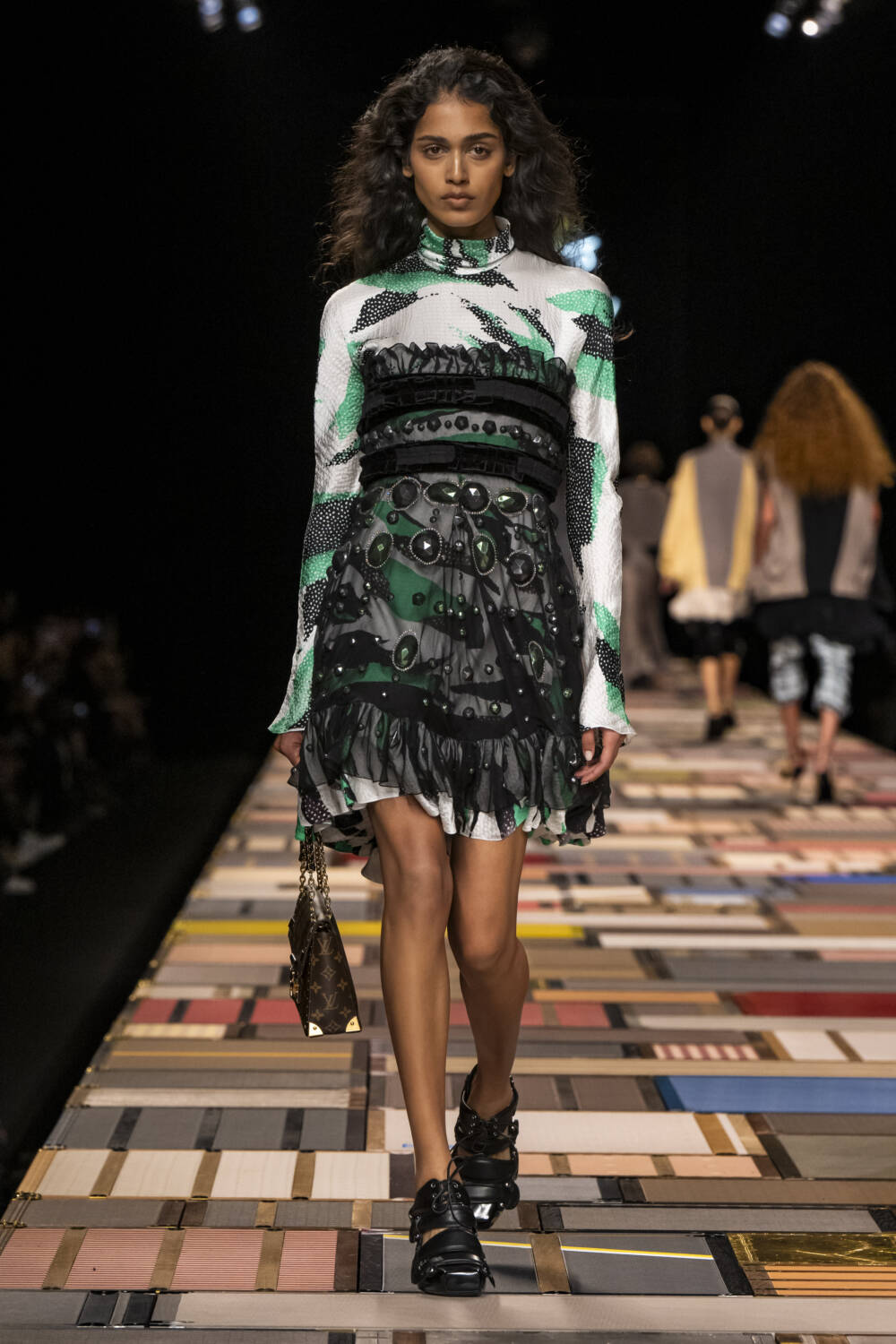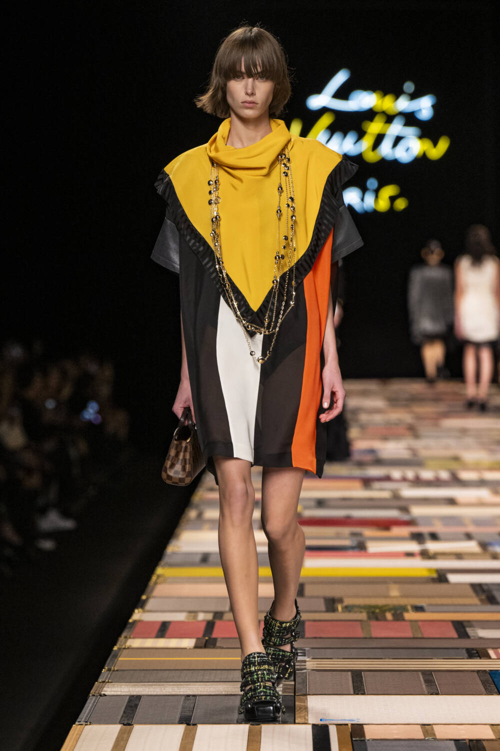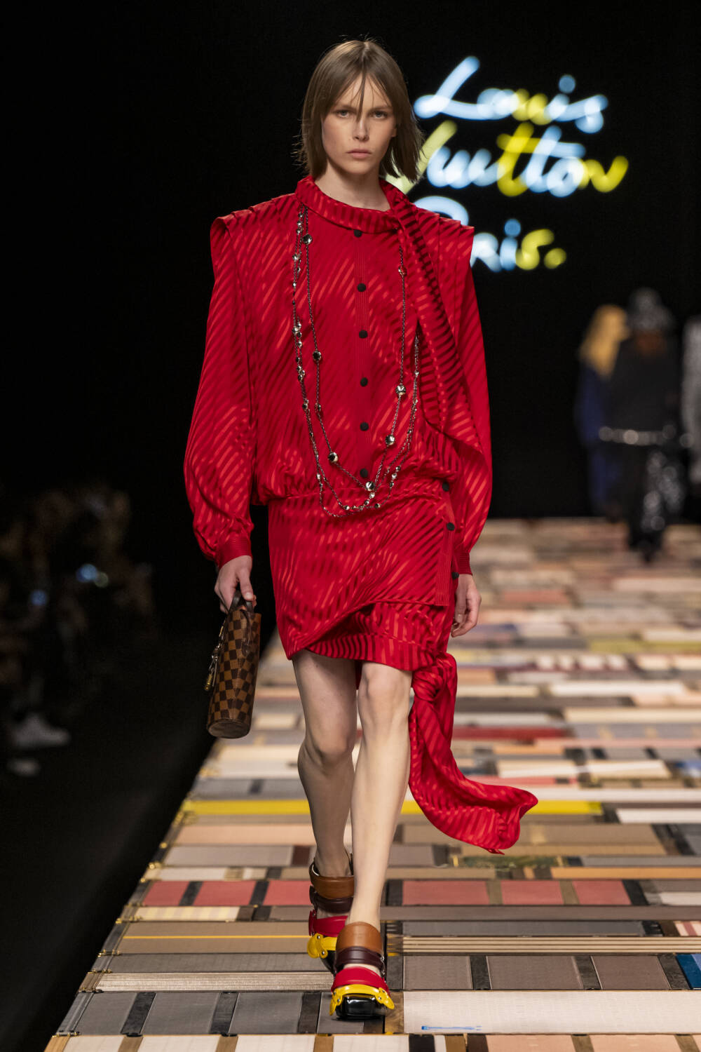 The models walked on a Jenga-like catwalk, made with  of more than 1,000 trunks, which was hydraulically raised at the beginning of the show.