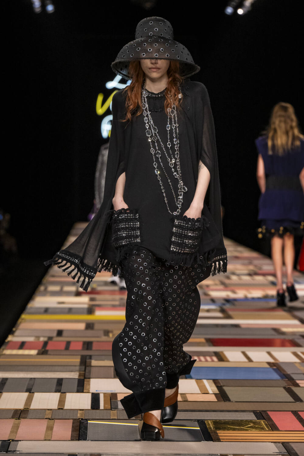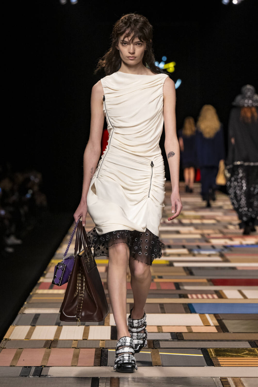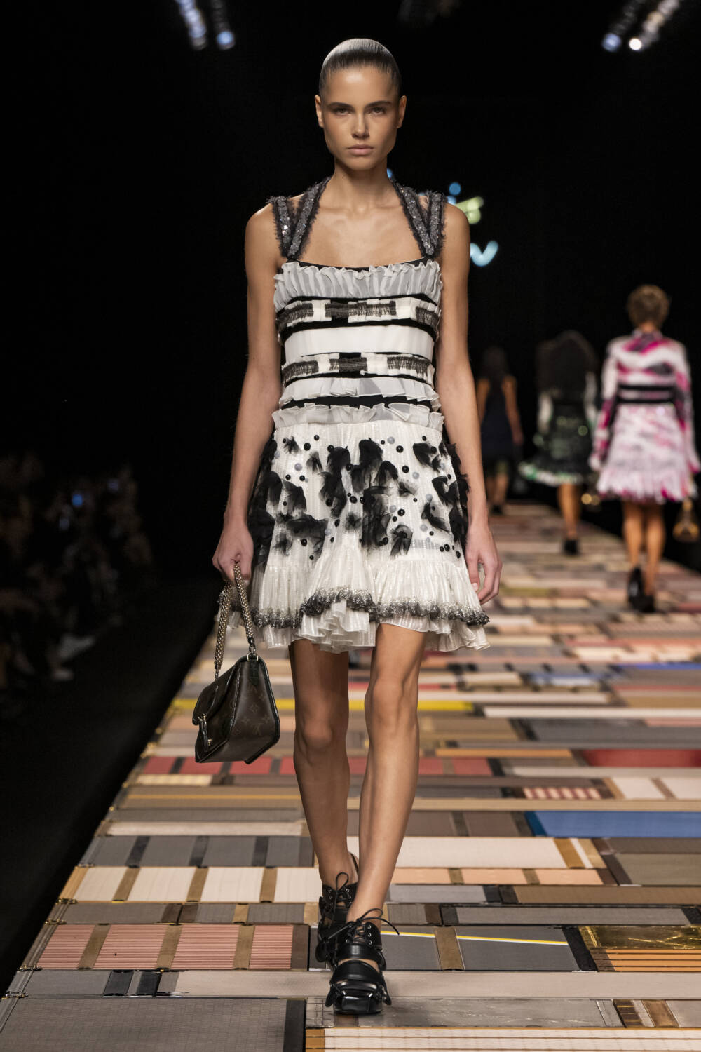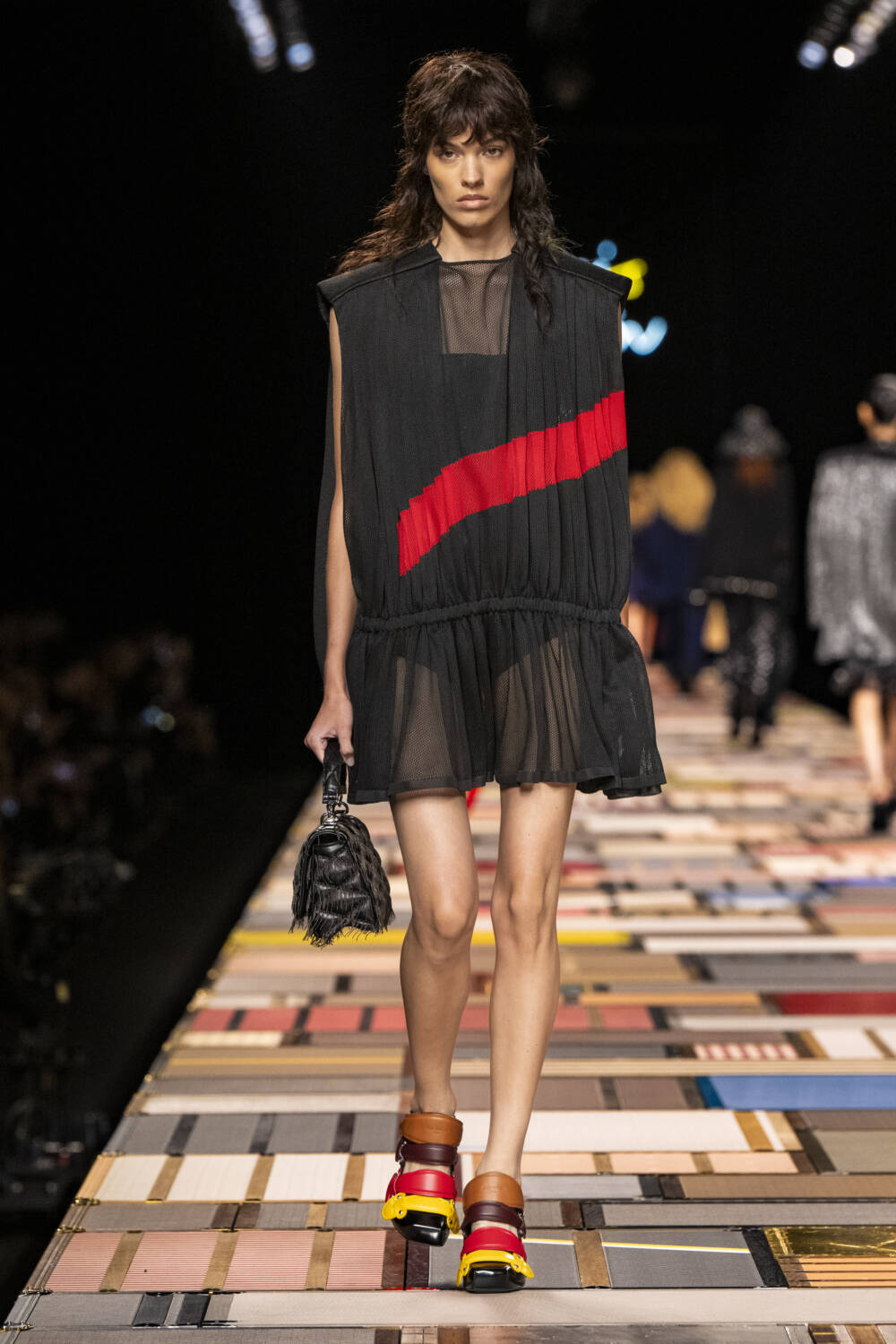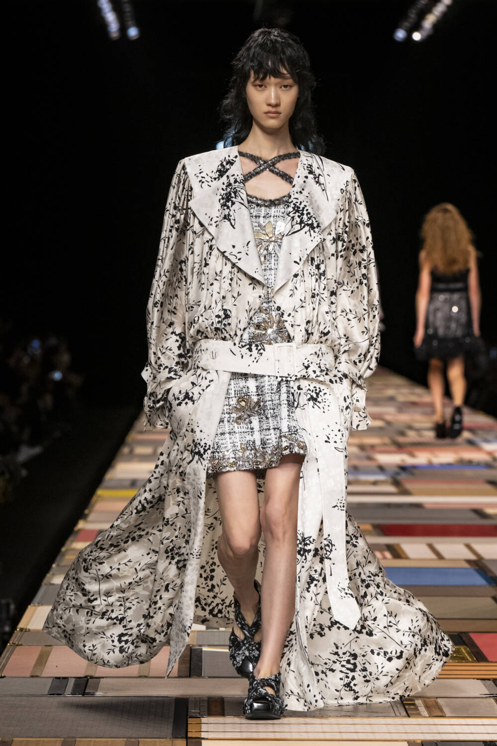 The models walked on a Jenga-like catwalk, made with  of more than 1,000 trunks, which was hydraulically raised at the beginning of the show.