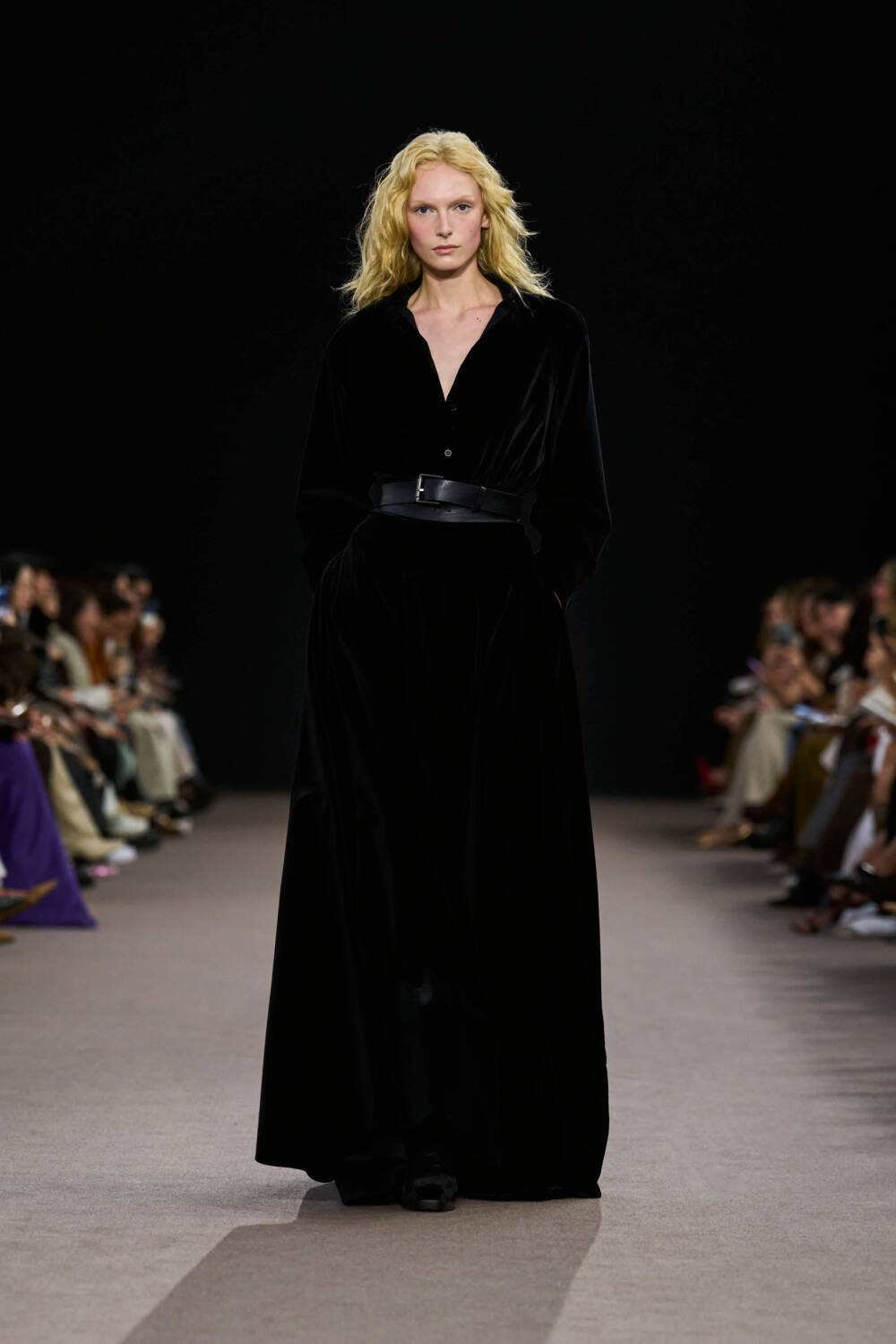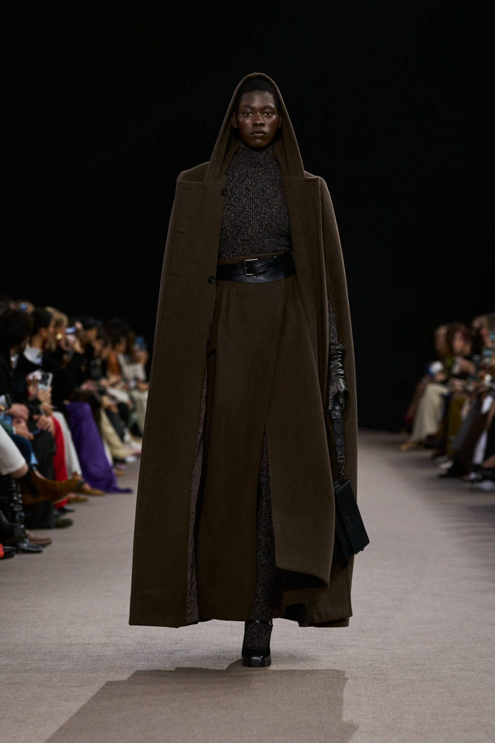 He is the master of silhouette and showed his design prowess in the expert way he handled the volumes of floor sweeping double face belted coats, great costs, parkas and oversized country-style gilets as well as the sumptuous velvet maxi skirts. Many looks were double belted at the waist and worn with square neck tanks that resembled bustiers. With its long sweeping silhouettes, the collection had an elegance and a sense of romance because Max Mara’s high flying boss ladies follow their passions. It didn’t look like costume. It looked like luxury, thanks in part to a rich palette of berry reds, mossy greens, autumnal brackens and Cascia, the name given by Max Mara insiders to the gradations from light to dark beige of raw cashmere.