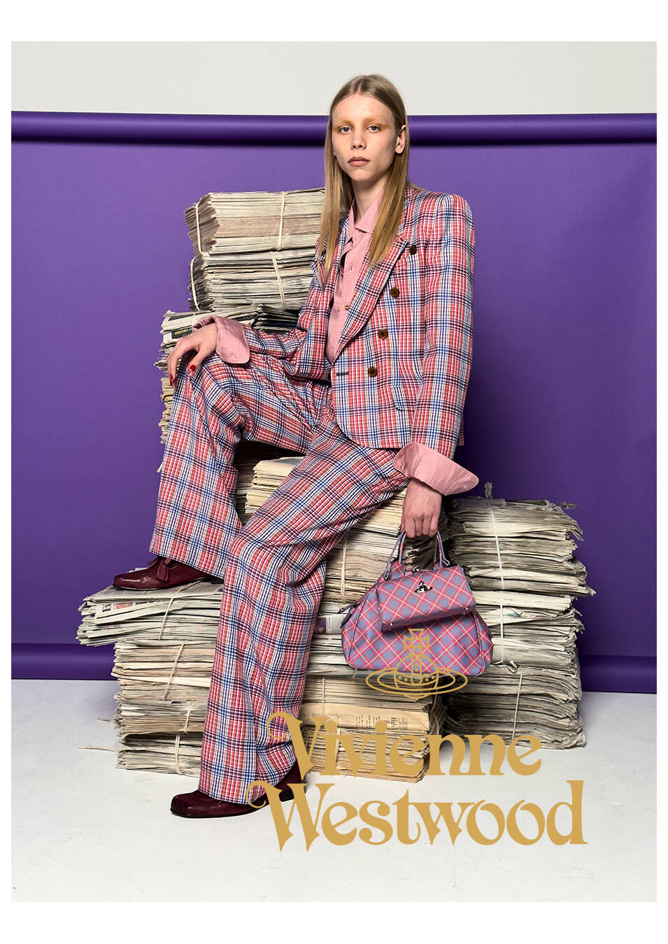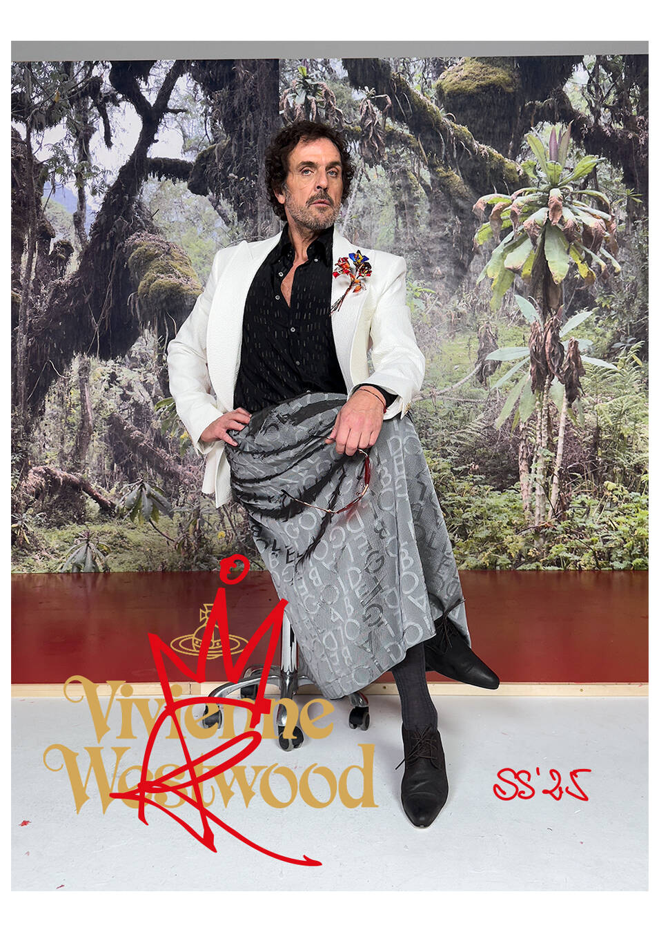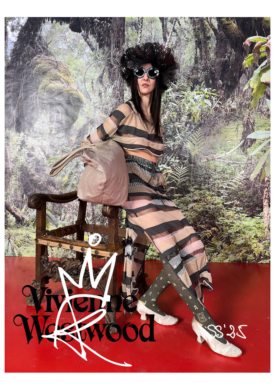 The SS25 Vivienne Westwood campaign, photographed by Juergen Teller, sets its eclectic clothes against imaginative backdrops and playful sets designed by Bernhard Willhelm. The photographs transcend the ordinary, celebrating the elegance of individual spirit. Drawing on a rich array of iconic references, they combine the sensual allure of Teller’s renowned gorilla imagery – set against a lush jungle backdrop – with the poised glamour of Marlene Dietrich, deconstructing her image in an evening gown. The narrative also nods to Madeleine Vionnet’s legendary use of transparency and tulle in haute couture, while vibrant red and purple hues infuse the visuals with depth and emotion, each colour telling its own distinct story. At the heart of the campaign lies a striking homage to Diana Vreeland’s iconic red room, adding an extra layer of sophistication and intrigue, and reinforcing the timeless yet daring spirit that has always been at the core of Vivienne Westwood’s vision. AB