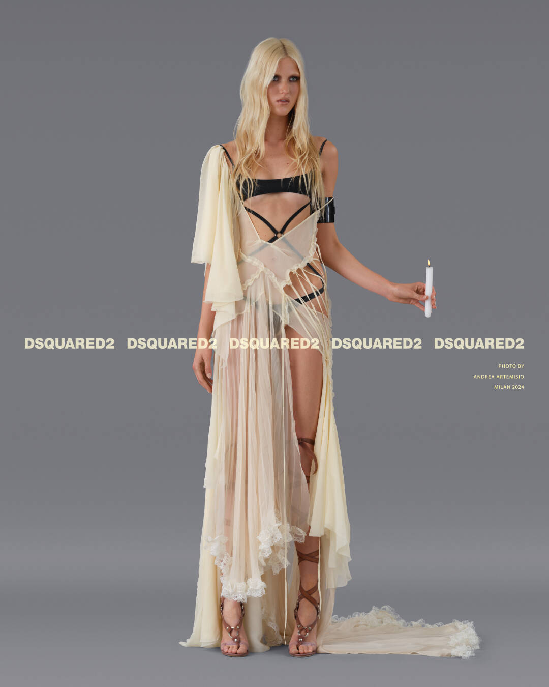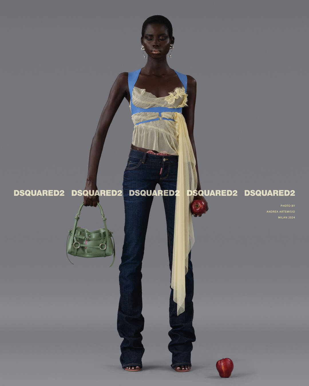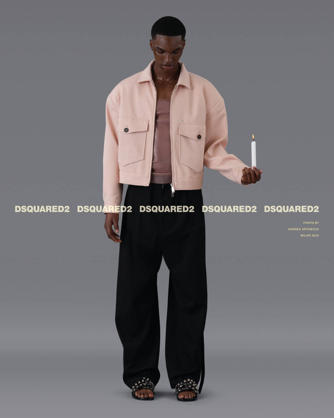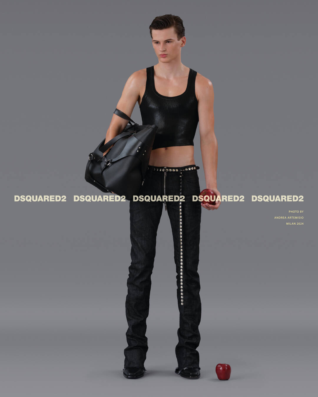 Dsquared2’s SS25 campaign, shot by Andrea Artemisio, is a striking play of contrasts – duality and desire in perfect tension. The collection blends internet e-boy softness with New York’s underground edge, pairing poetic pastels with bondage hardware, silk with leather, and delivering denim that clings to the skin. Artemisio’s hyperreal portraits spotlight this bold vision, set against a stark grey backdrop. Three enigmatic symbols – an apple, a candle, a rose – add layers of mystery, hinting at ritual and romance. In this celebration of self-expression, Dsquared2 dares us to embrace the power of dressing boldly. AB
