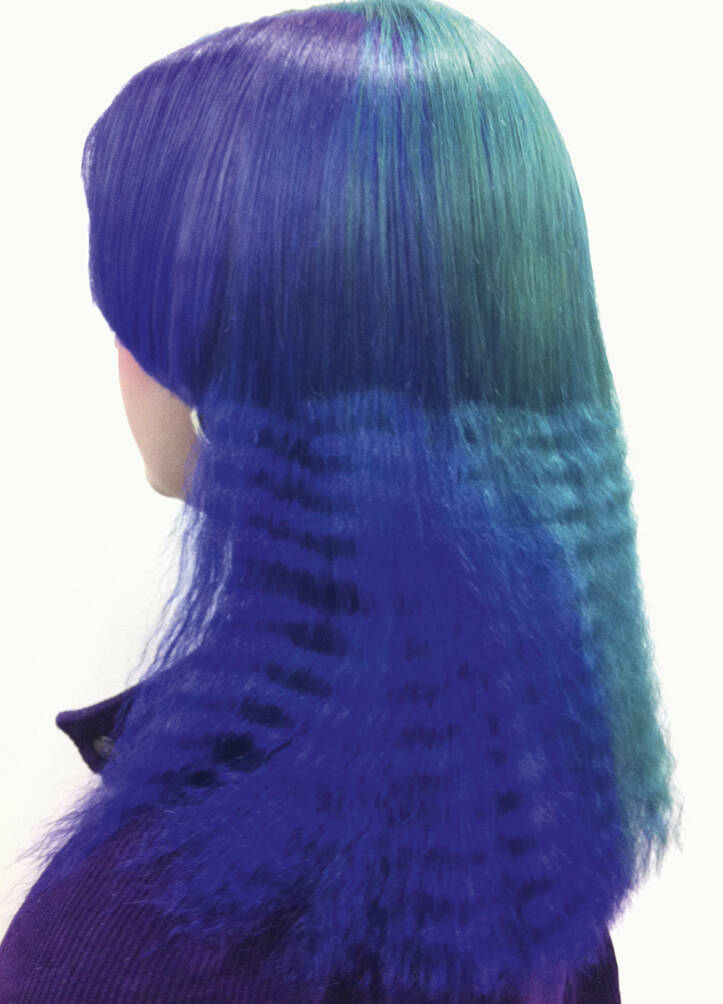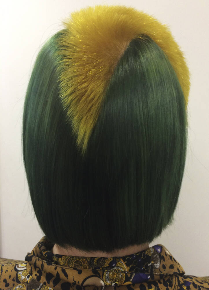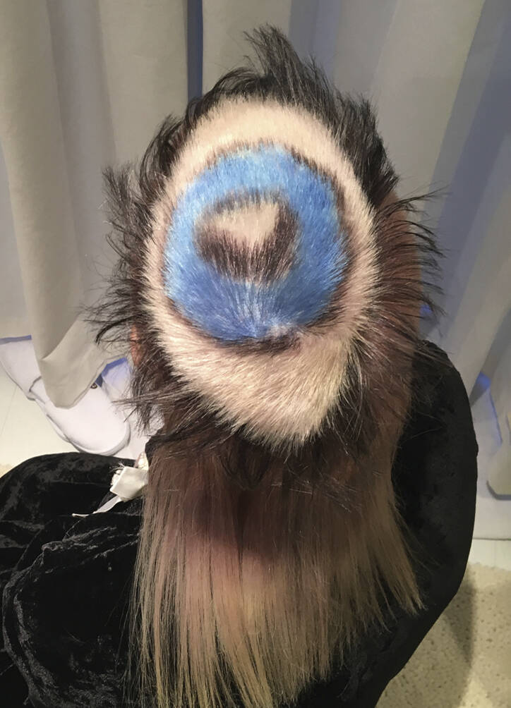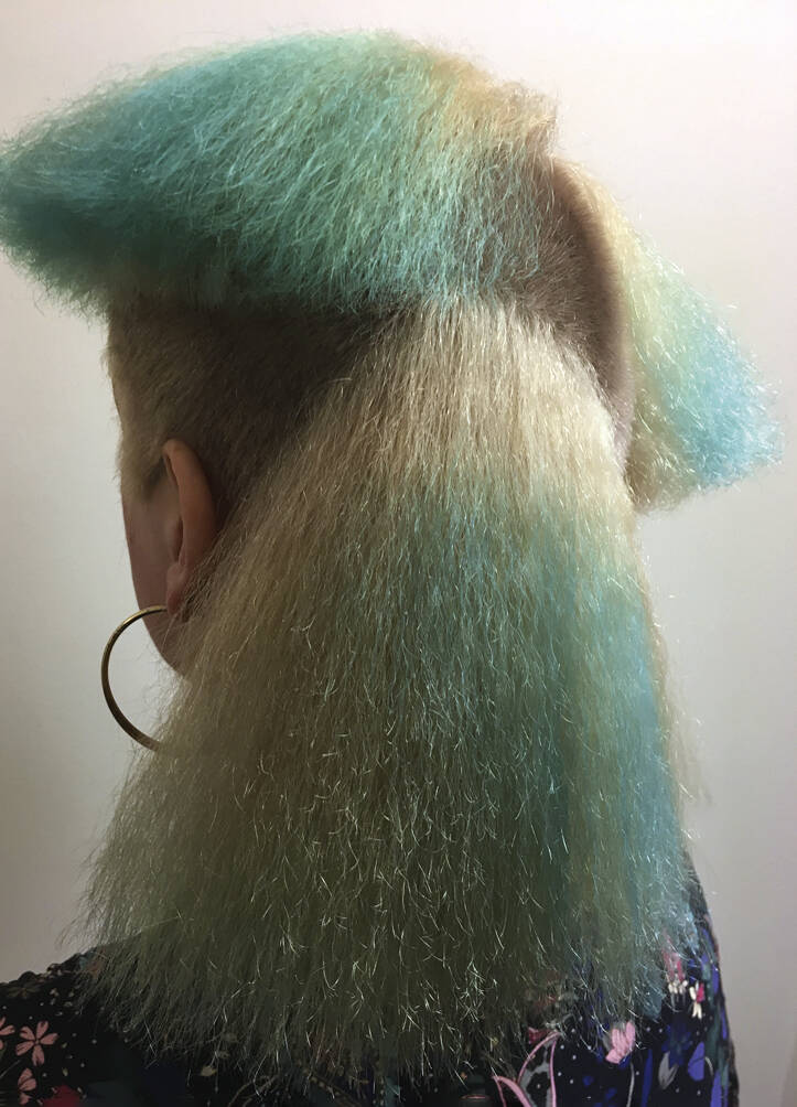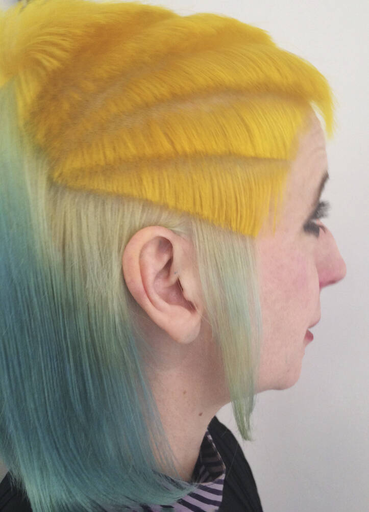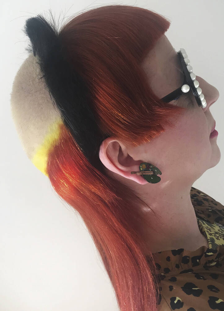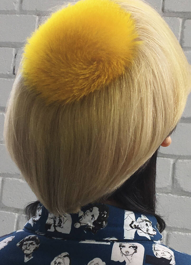 All three bring visual references: lots of parrot and feathery stuff, as well as underwater things, references to Zaha Hadid’s buildings and society pictures. Hayes must also bring her entire colour spectrum. “One time I left out a shade but then we decided we needed it,” she rues. “We never really know where it’s going to go,” says Vial, with ideas evolving on the day. “I like mushing up these pop cultural references within a hairdo,” says Verhoeven, who can mix Home Counties blow dries, tropical fish, birds of paradise and punk all into one do. One recent do featured an eyeball complete with frond-like lashes shaved into the top of her head. Another was inspired by the Duchess of York in her ’80s headband era. “We did a little graduated bob at the front with a fringe, because Sarah Ferguson used to have one. A band of black hair forms a tufty headband but the back is completely shaved,” says Vial. Verhoeven enjoys the perception shift of looking like a minor royal from the front and a punk princess from the back. “We tagged Sarah Ferguson but she didn’t reply – obviously,” says Vial with a wink.
