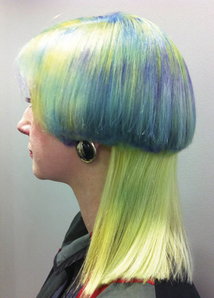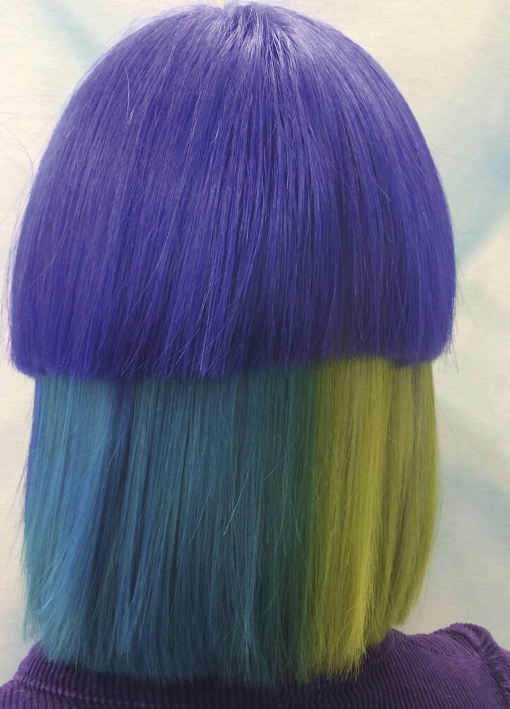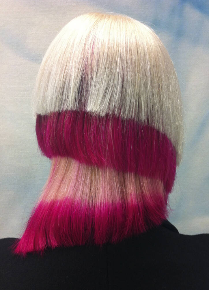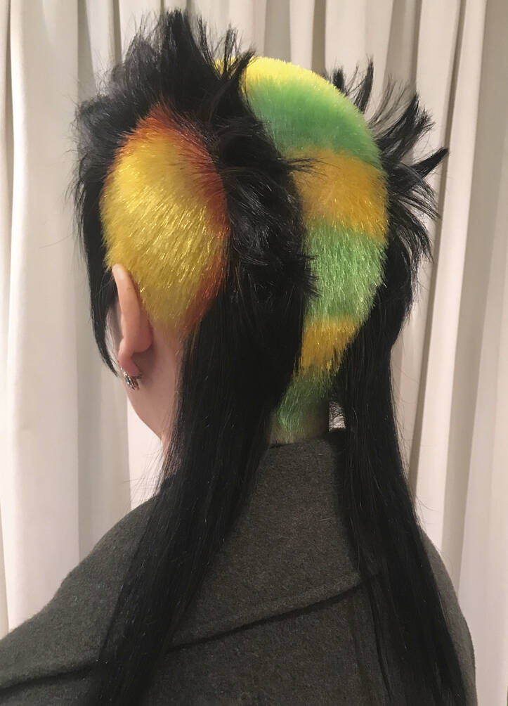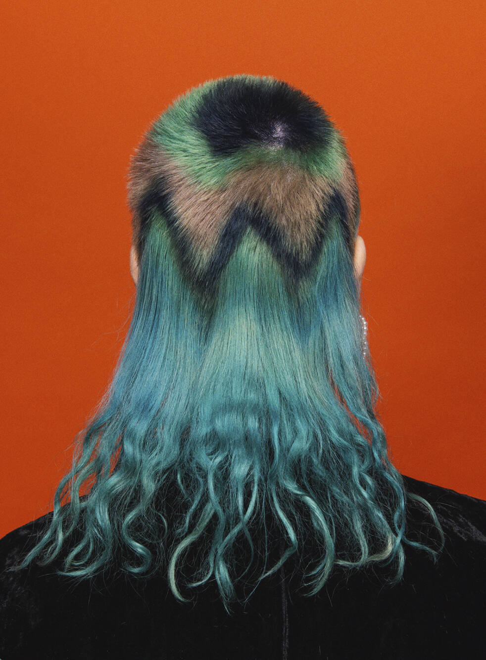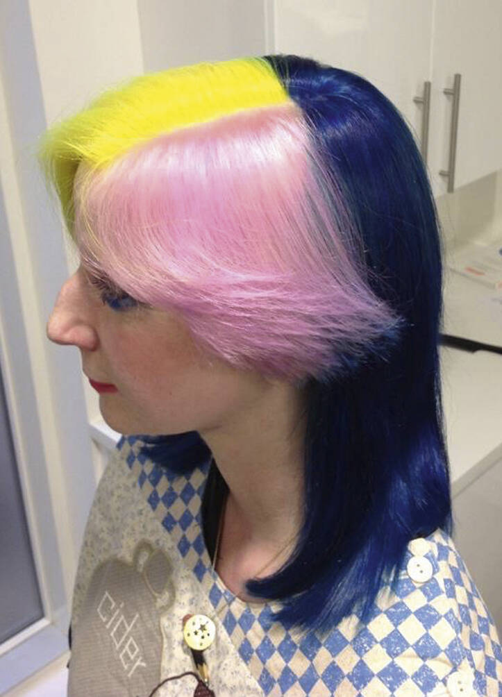 All three bring visual references: lots of parrot and feathery stuff, as well as underwater things, references to Zaha Hadid’s buildings and society pictures. Hayes must also bring her entire colour spectrum. “One time I left out a shade but then we decided we needed it,” she rues. “We never really know where it’s going to go,” says Vial, with ideas evolving on the day. “I like mushing up these pop cultural references within a hairdo,” says Verhoeven, who can mix Home Counties blow dries, tropical fish, birds of paradise and punk all into one do. One recent do featured an eyeball complete with frond-like lashes shaved into the top of her head. Another was inspired by the Duchess of York in her ’80s headband era. “We did a little graduated bob at the front with a fringe, because Sarah Ferguson used to have one. A band of black hair forms a tufty headband but the back is completely shaved,” says Vial. Verhoeven enjoys the perception shift of looking like a minor royal from the front and a punk princess from the back. “We tagged Sarah Ferguson but she didn’t reply – obviously,” says Vial with a wink.