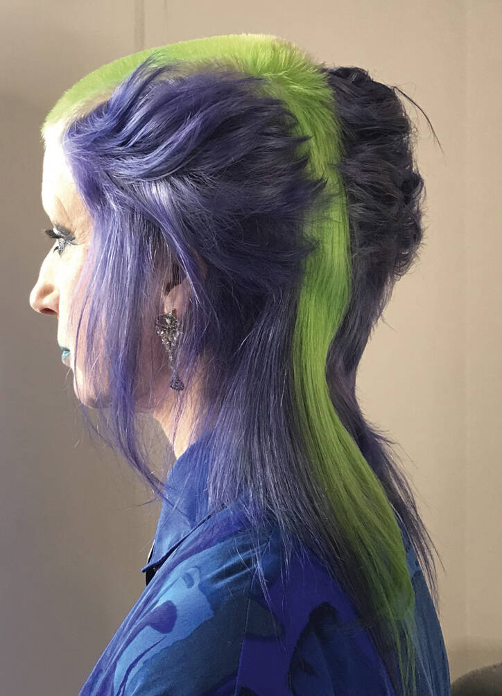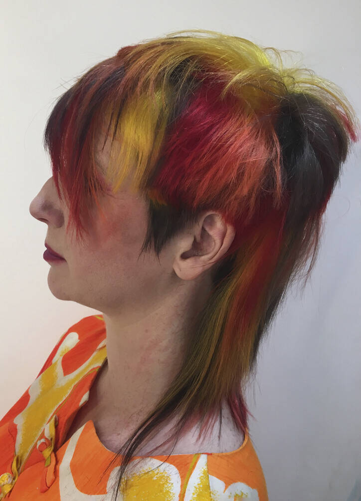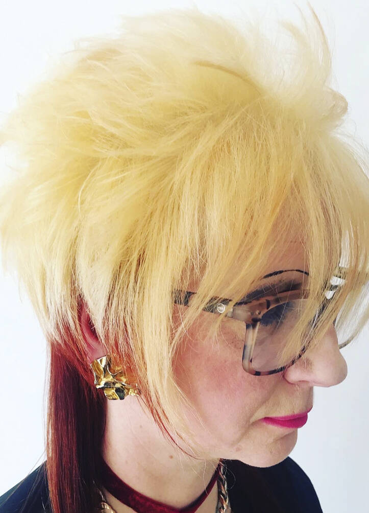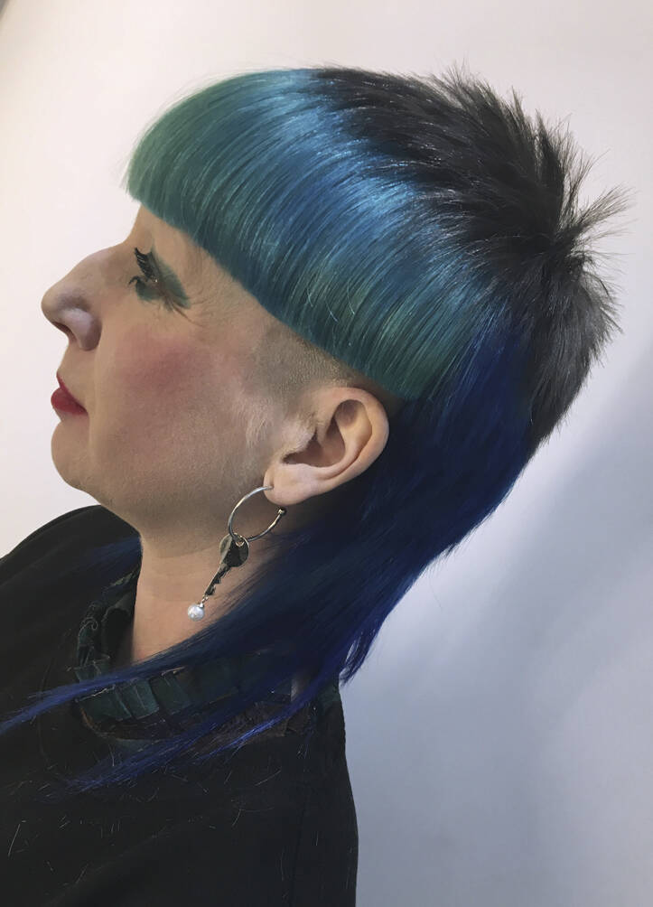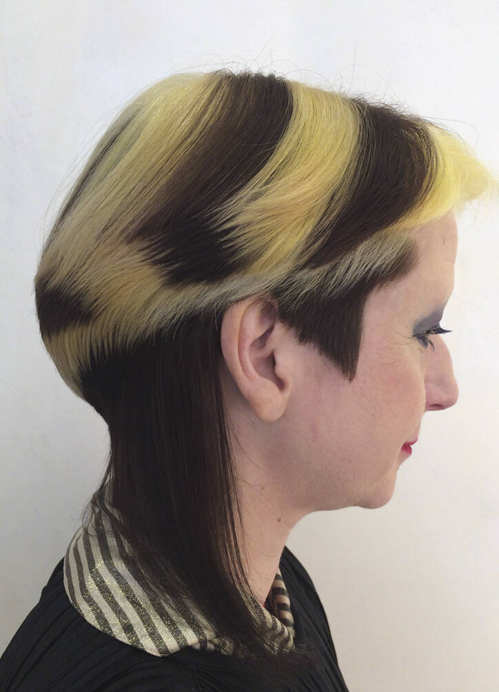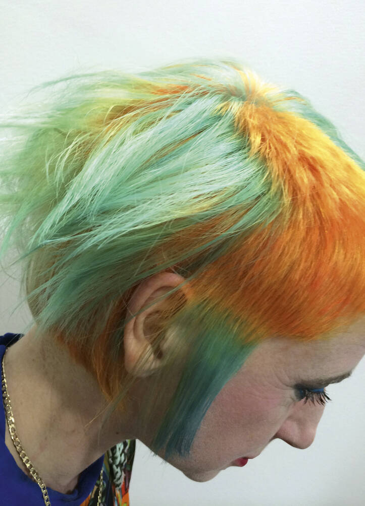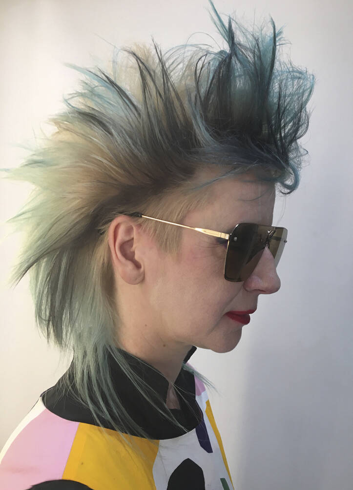 Once a ‘do’ is finished, Vial says all three feel euphoric. “We look at each other and can’t believe we’ve been so silly. It just feels really naughty,” says Verhoeven. Then it’s time to unleash the look on the world. Other people’s reactions are an important part of the process for Verhoeven. “I’ve got a very patient partner, thank god,” she says of her train driver husband, Leon, who is usually the first to see her. “He’s always trying to be positive about it even though it’s really extreme,” says Vial. The three collaborators have a running joke – what’s Leon going to say when she walks in the door? “I have to report back to Tracy and John. He’s always in shock,” she says, recalling the unveiling of a look dubbed by Vial and Hayes ‘Ladies of the Bowling Green’. Her crown was shaved close and dyed a vivid, lawn-green but surrounded by lavish layers of blonde Lady Di flicks. When she walked in with that, he said, “For fuck’s sake!”