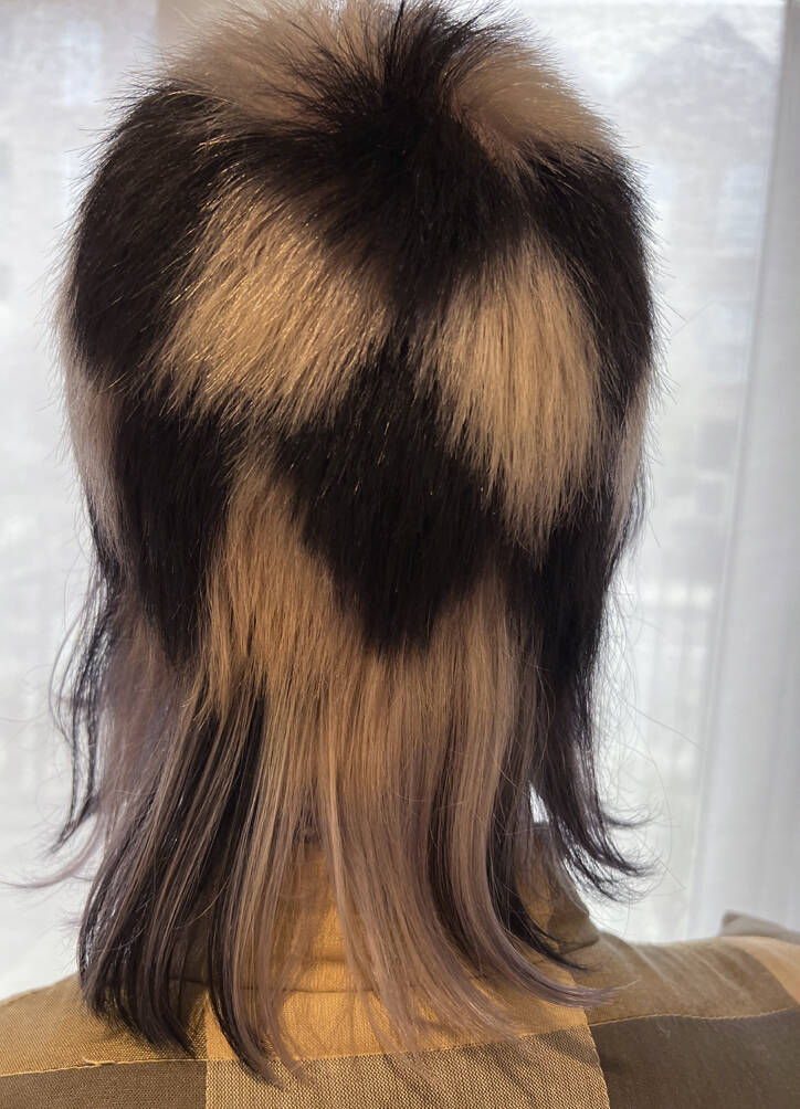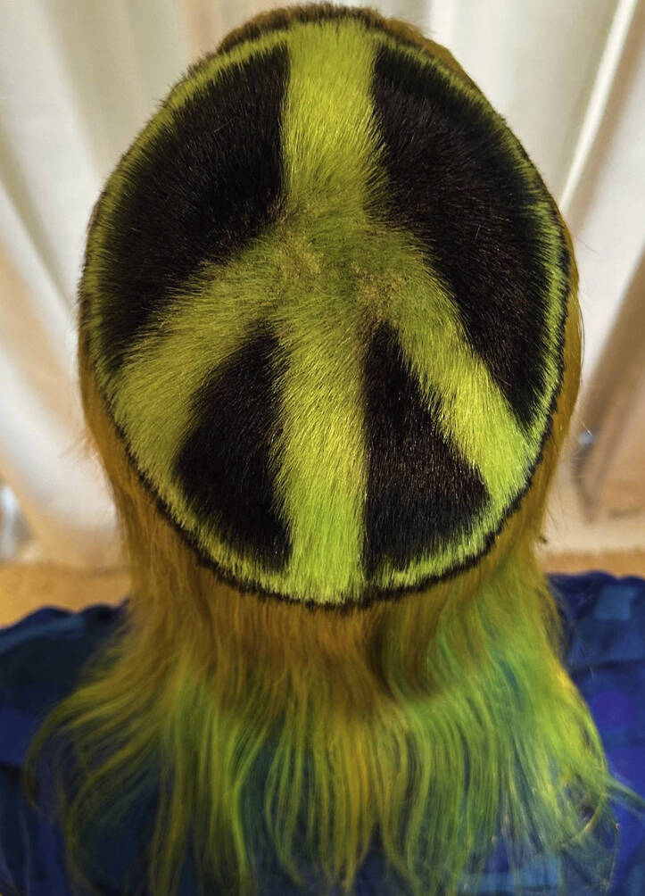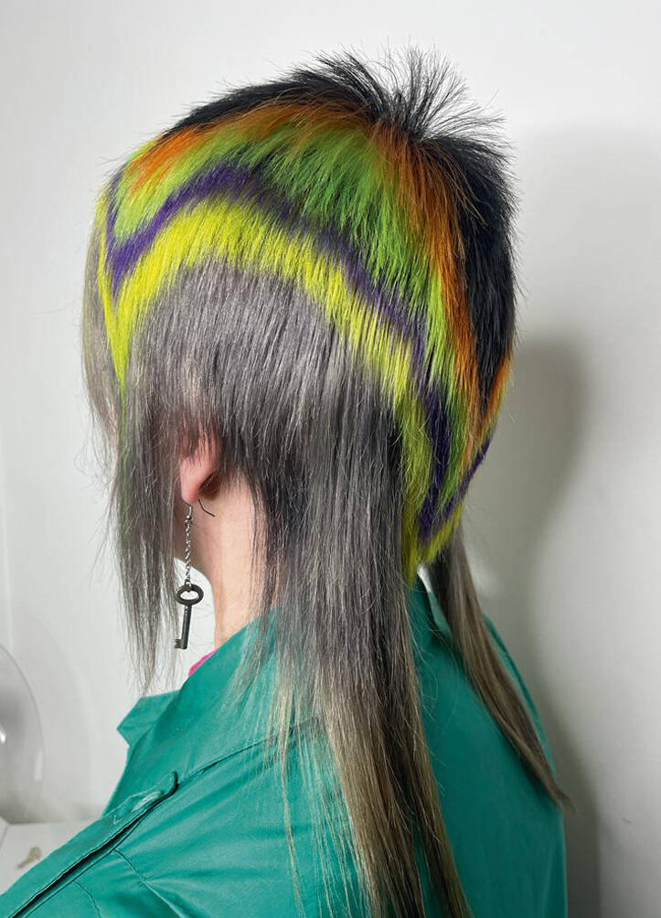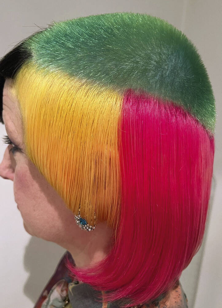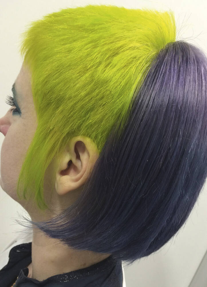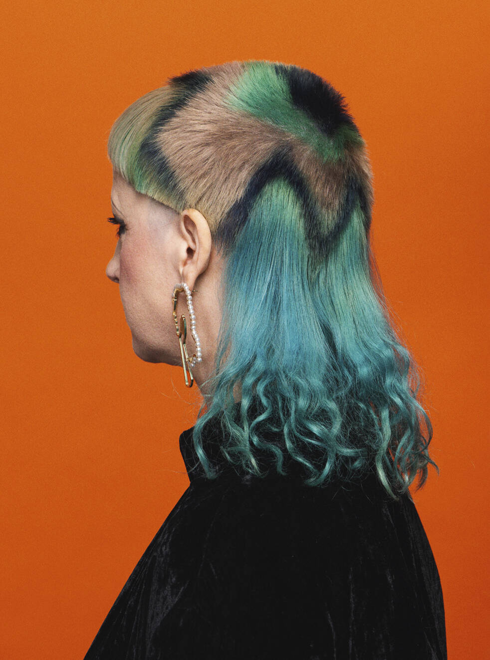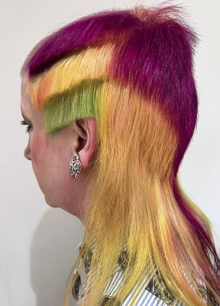Once a ‘do’ is finished, Vial says all three feel euphoric. “We look at each other and can’t believe we’ve been so silly. It just feels really naughty,” says Verhoeven. Then it’s time to unleash the look on the world. Other people’s reactions are an important part of the process for Verhoeven. “I’ve got a very patient partner, thank god,” she says of her train driver husband, Leon, who is usually the first to see her. “He’s always trying to be positive about it even though it’s really extreme,” says Vial. The three collaborators have a running joke – what’s Leon going to say when she walks in the door? “I have to report back to Tracy and John. He’s always in shock,” she says, recalling the unveiling of a look dubbed by Vial and Hayes ‘Ladies of the Bowling Green’. Her crown was shaved close and dyed a vivid, lawn-green but surrounded by lavish layers of blonde Lady Di flicks. When she walked in with that, he said, “For fuck’s sake!”