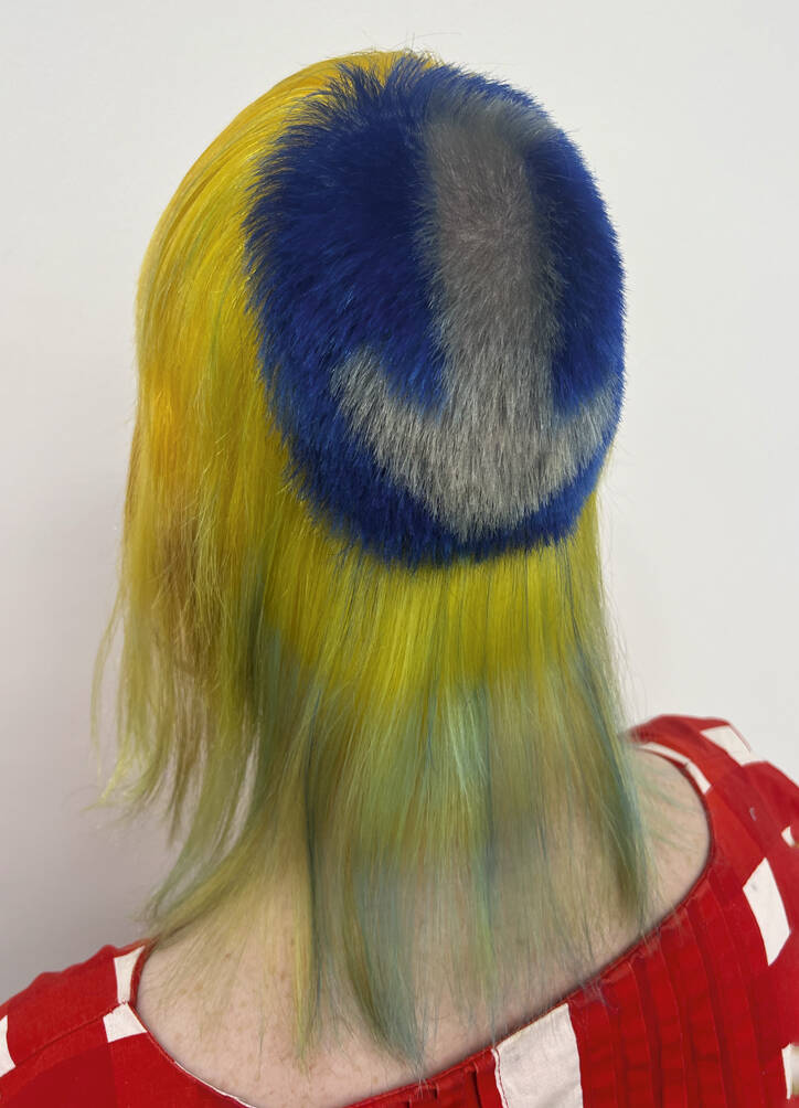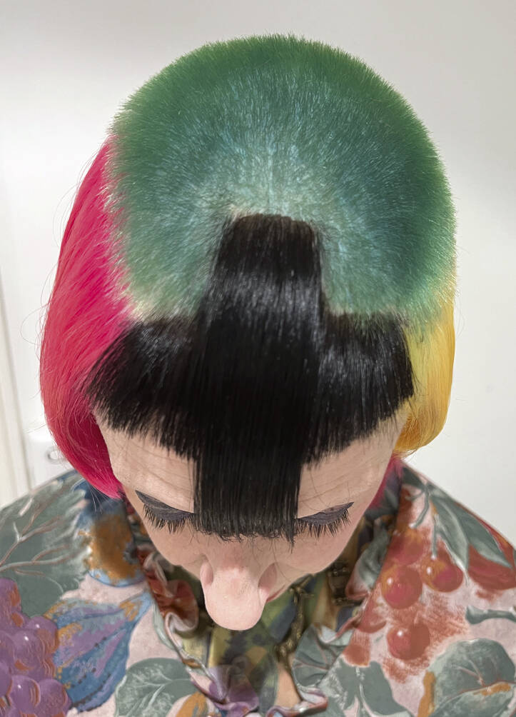 Julie Verhoeven sporting the ‘Cheer Up, It Might Never Happen’ do, inspired by Wimbledon’s tennis balls and bird feathers. Cut by John Vial, colour by Tracy Hayes, both long-time collaborators of Verhoeven