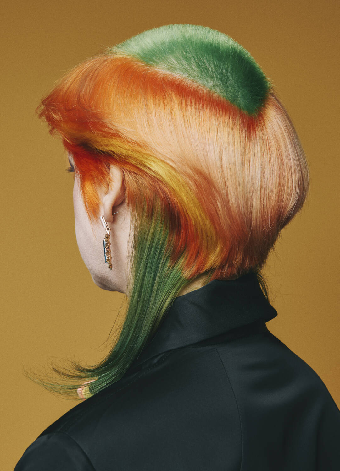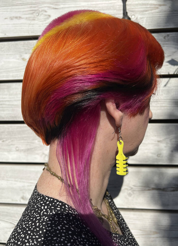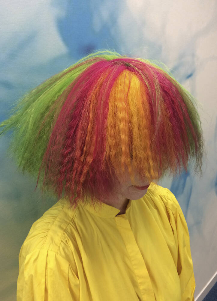 She relishes the clippers coming out. “It feels like starting again.” One of her recent favourites was the fried egg (shaved on the crown and dyed yellow) “because it was so tactile”. Did people want to touch it? “No, sadly. That was very disappointing,” she says with a sigh. She’s experimented with calmer colours but says “it makes it a bit sad”. That said, she swims every day, “so the colour does fade, but I kind of like that because there’s a moment when they are on full throttle and then they become more subdued.”