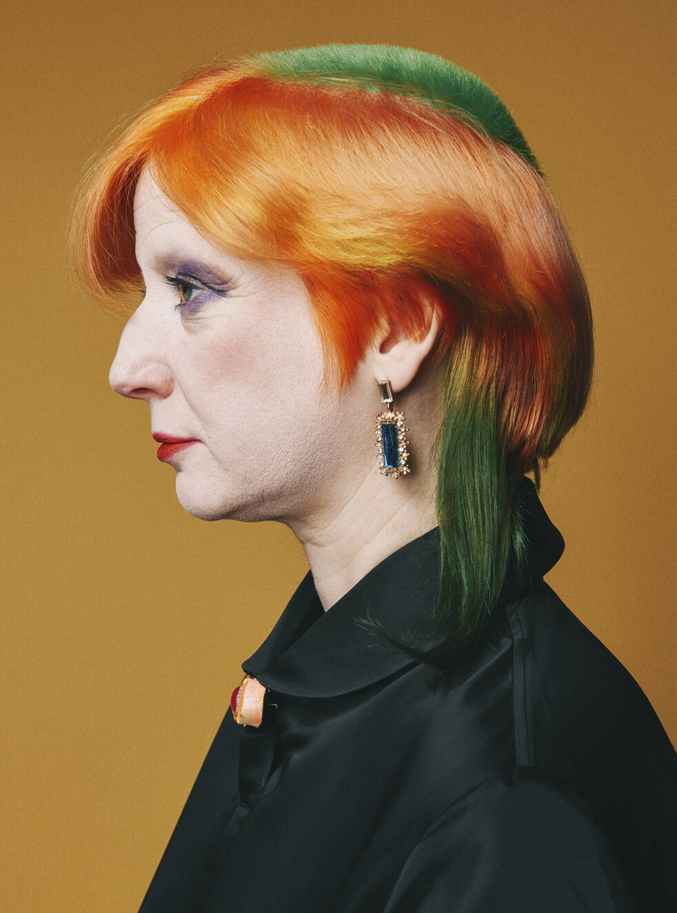Verhoeven’s hair took a more extreme turn around 15 years ago. She had experimented with dying it, but for the most part kept it long, “because I wanted a boyfriend”. By the time she’d reached her late thirties, she was ready for something more radical. “I wanted to have a good haircut.” She became obsessed with Vidal Sassoon’s famed five-point cut. There was only one man who could reproduce the precision of that style: John Vial, a Sassoon alumni and the only person the legendary Vidal trusted to cut his own hair. She’d met him at Saint Martins, where Verhoeven was lecturing. Vial, who was best friends with the infamous Fashion MA course director Louise Wilson, was always in and out of the building and did the hair for the annual graduation show. “We started off semi-sensible,” says Verhoeven of that first statement cut, but it quickly evolved into something more. Vial brought colour expert Tracy Hayes onboard and soon all three were mood boarding ever more challenging ideas. “We egg each other on,” she says.