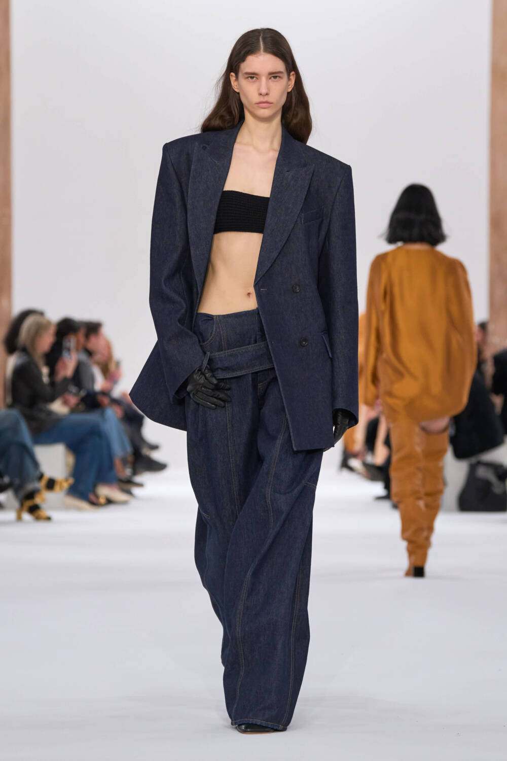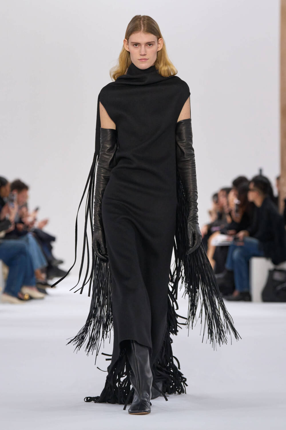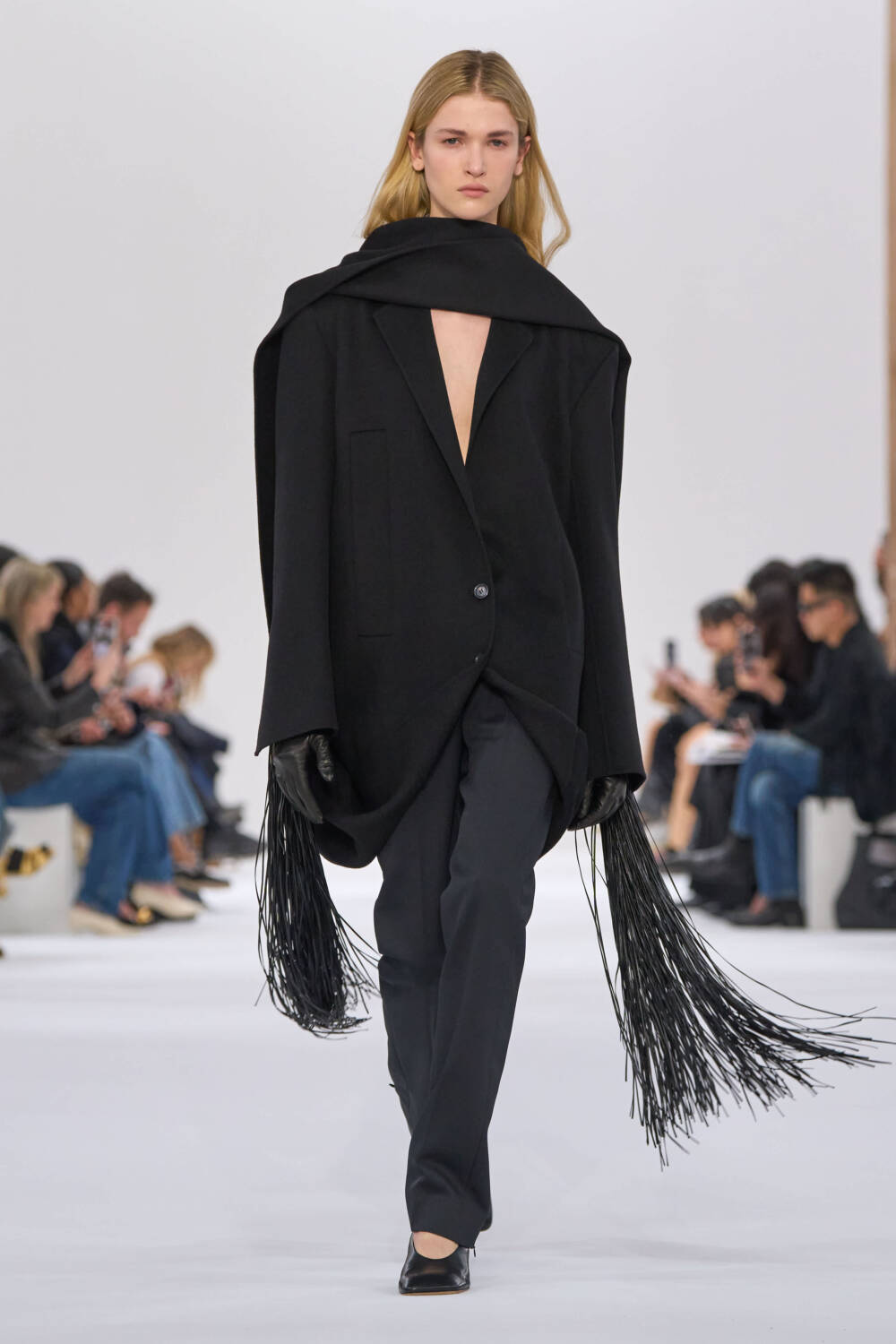 Sportmax put a woman in motion at the heart of the collection, sending out dynamic pieces that combined practicality and purpose with great sense of style. Oversized suiting, swashbuckling thigh boots and swathes of lavishly fringed scarves were the focus of a collection that was rooted in cool, contemporary dress codes. Sleek, draped jersey dresses, tonal tailoring in black grey, bitter chocolate and navy and plenty of superb floor sweeping coats made for a strong showing.