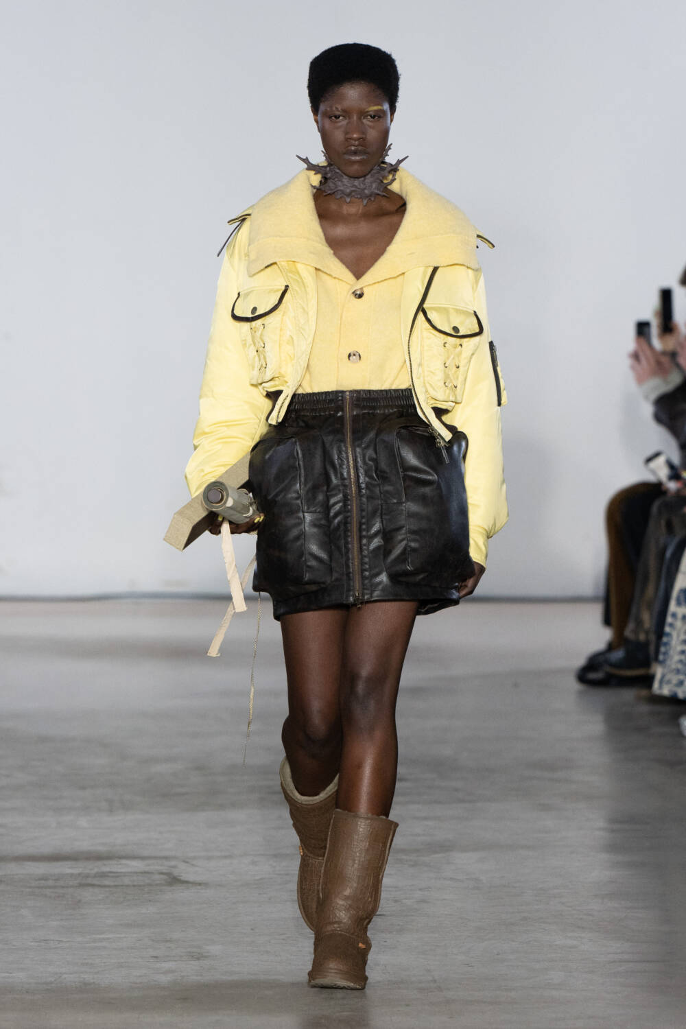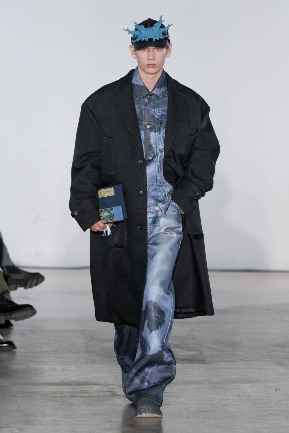 Feng Chen Wang’s AW25 collection breathes life into ancient mythology. Drawing from Chinese artistry, Wang channels the fantastical spirit of Shan Hai Jing, transforming mythical creatures into handcrafted Jingdezhen ceramics. “I have been passionate about painting since the age of eight, and throughout my life, art has been a constant source of inspiration and expression. Over time, I’ve developed a deep interest in blending various elements I love, such as fashion and my artistic work, to create cohesive, meaningful collections. My fascination with the Shan Hai Jing has been long-standing, and it has consistently influenced my creative process. In fact, my home and studio are filled with antique creature artefacts, which have become key sources of inspiration for my designs,” says Wang. Traditional designs are reimagined as prints on raw denim and organic fabrics and  bonded neoprene mimics wool, reinforcing structure while preserving fluidity in tailored silhouettes. Hand-painted textiles pay homage to ink wash aesthetics, while her exclusive UGG Tasman Lug shoe is elevated into a wearable sculpture. Like the legends that inspired it, this collection is boundless, both timeless and visionary. The designer adds, “This season’s collection is more commercial and I believe that as I have got older and become more of an experienced designer, I have a better understanding of the balancing craftsmanship and consumer sensibility and being more globally aware of the fusion of the East and the West consumer and their desires.” SL